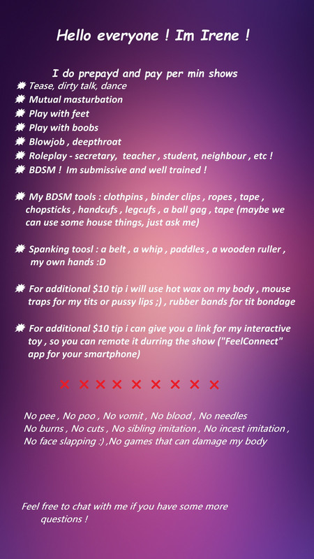 ÎNCĂ NU, Înregistrează-te gratuitTrebuie să ADĂUGI FONDURI în contul tău pentru a putea suna Blondy_Irene sau orice alt model. Acesta este un sistem securizat care îți permite să plătești pentru show-uri private pe Skype cu plată per minut.