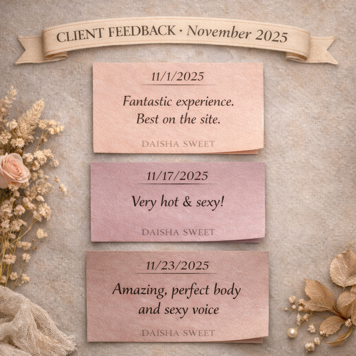 Puoi RICHIEDERE UN APPUNTAMENTO con Daisha Sweet quando ti è più comodo. Tutto è impostato sul tuo fuso orario e sulle tue ore locali. Lei riceverà la tua richiesta e la accetterà se la sua agenda è libera. Riceverai una conferma via email e potrai prepararti per la tua esperienza piccante.